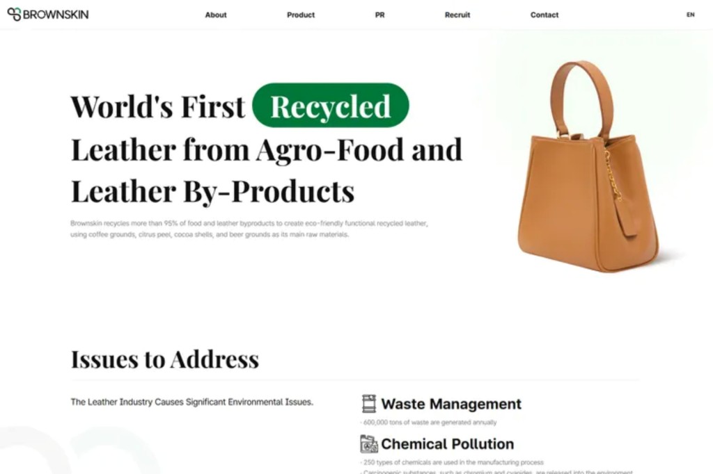 이번 리뉴얼에서 가장 공을 들인 부분은 브라운스킨의 기술과 데이터를 데이터베이스로 구축하는 작업이었습니다. 현재 국내에는 자원순환율에 대한 공식적인 기준이 마련되어 있지 않습니다. 그래서 해외 연구자료를 면밀히 검토하여 수치를 표준화하는 작업을 먼저 진행했습니다. 이 과정에서 재생가죽의 재사용률 데이터를 정량화하고, 기존에 작업했던 포트폴리오 전체를 대상으로 개별 수치화 작업을 수행했습니다.