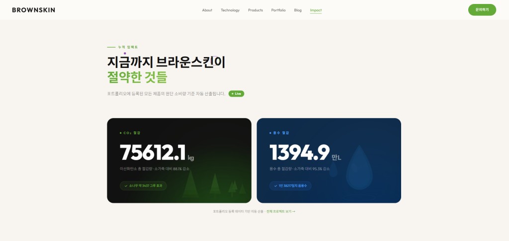 더 근본적인 문제는 따로 있었습니다. 브라운스킨이 만들어내는 환경적 임팩트가 홈페이지에 제대로 표현되지 못하고 있었습니다. 포트폴리오를 업데이트할 때마다 관련 수치를 일일이 수작업으로 작성해야 하는 구조였고, 이 번거로움이 결국 임팩트 데이터 업데이트를 지연시키는 원인이 되고 있었습니다. 좋은 제품을 만들고도 그 의미를 제대로 전달하지 못하는 상황이었던 것입니다.
