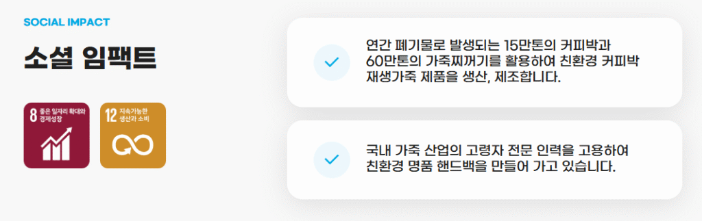 저희 브라운스킨은 업사이클링 재생가죽 을 통해 6기에 선정되어 참여했고, UN SDGs 기준 8번과 12번을 지키기 위해 노력하고 있습니다.