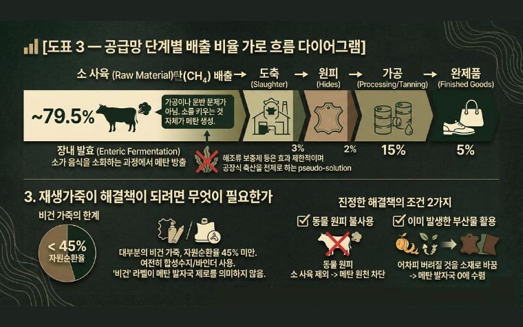 장내 발효(Enteric Fermentation) — 소가 음식을 소화하는 과정에서 메탄을 방귀와 트림으로 방출하는 생물학적 현상입니다. 이것이 가죽 메탄 발자국의 거의 전부를 차지합니다. 가공 공정이나 운반의 문제가 아닙니다. 소를 키우는 것 자체가 메탄을 만들어냅니다.