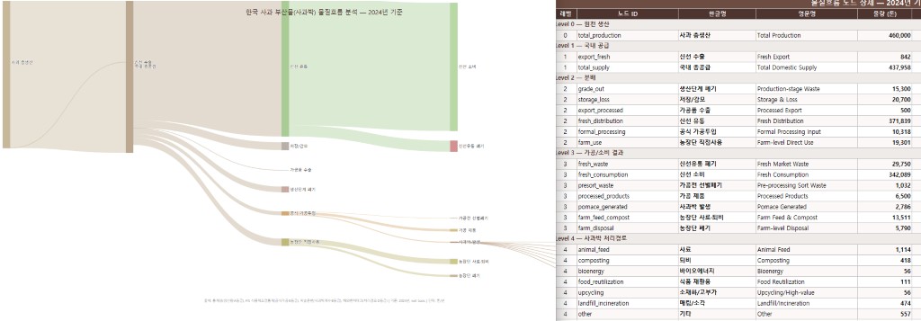 동일한 코드를 공유하도록 설계하여 물질흐름을 확인하기 쉽게 만들었습니다. 예를들어 생산량 460,000t(2024)을 넣으면 사과박 2,786t, 신선유통 폐기 29,750t이 자동으로 계산되게 됩니다. 이 부분은 각 작목별도 별도의 데이터와 서식이 필요한 부분입니다. 이 부분들도 최대한 데이터를 확보하여 신뢰도를 높이고자 하고 있습니다.